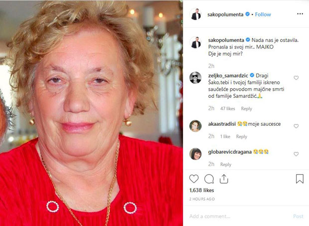 - Nada nas je ostavila. Pronašla si svoj mir... Majko, gde je moj mir? - napisao je Polumenta, kojem su pratioci, znani i neznani, pokušali da pruže reči utehe i upute mu saučešće.