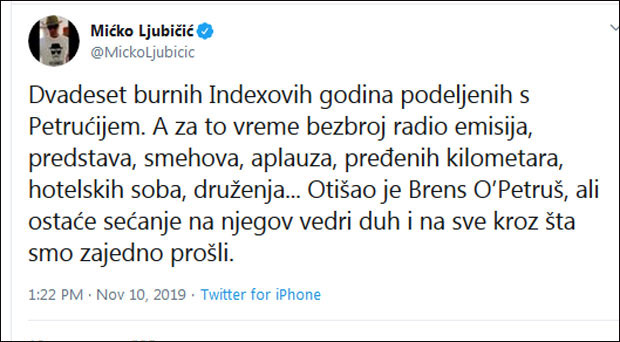 - Dvadeset burnih Indeksovih godina podeljenih s Petrućijem. A za to vreme bezbroj radio emisija, predstava, smehova, aplauza, pređenih kilometara, hotelskih soba, druženja... Otišao je Brens O’Petruš, ali ostaće sećanje na njegov vedri duh i na sve kroz šta smo zajedno prošli.