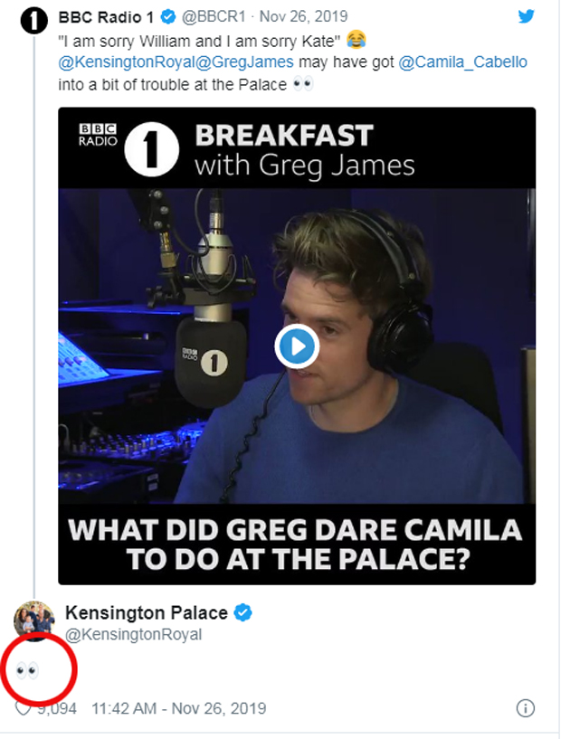 Kejt i Vilijam su objavom na Tviteru sugerisali kako su primetili da Kamila krade od njih, tako što su joj odgovorili na priznanje sa “ogromnim očima”.