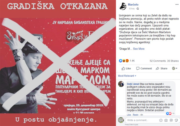 POPULARNI tekstopisac i reper Marko Šelić Marčelo trebalo je da održi književnu promociju u sredu, na platou Kulturnog centra u Gradiški, u Republici Srpskoj, međutim, događaj je otkazan zbog, kako navodi Marčelo, problema sa organizatorima. Šelić je na "Fejsbuku" detaljno objasnio situaciju.