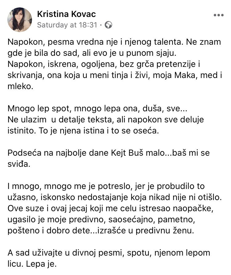 - Ne znam gde je bila do sad, ali evo je u punom sjaju. Napokon, iskrena, ogoljena, bez grča pretenzije i skrivanja, ona koja u meni tinja i živi, moja Maka, med i mleko. Ne ulazim u detalje teksta, ali napokon sve deluje istinito. To je njena istina i to se oseća. Podseća na najbolje dane Kejt Buš malo... Baš mi se sviđa - započela je Kristina, a potom nastavila: