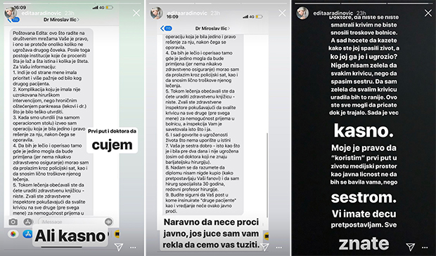 Edita se lekaru javno obratila putem Instagrama, a zatim je obelodanila njihovu prepisku, a uz to je poručila da će tužiti hirurga.