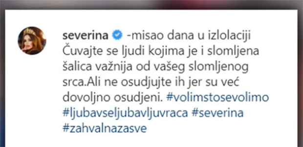 - Misao dana u izolaciji - Čuvajte se ljudi kojima je i slomljena šoljica važnija od vašeg slomljenog srca. Ali ne osuđujte ih jer su već dovoljno osuđeni - napisala je Severina na Instagramu.