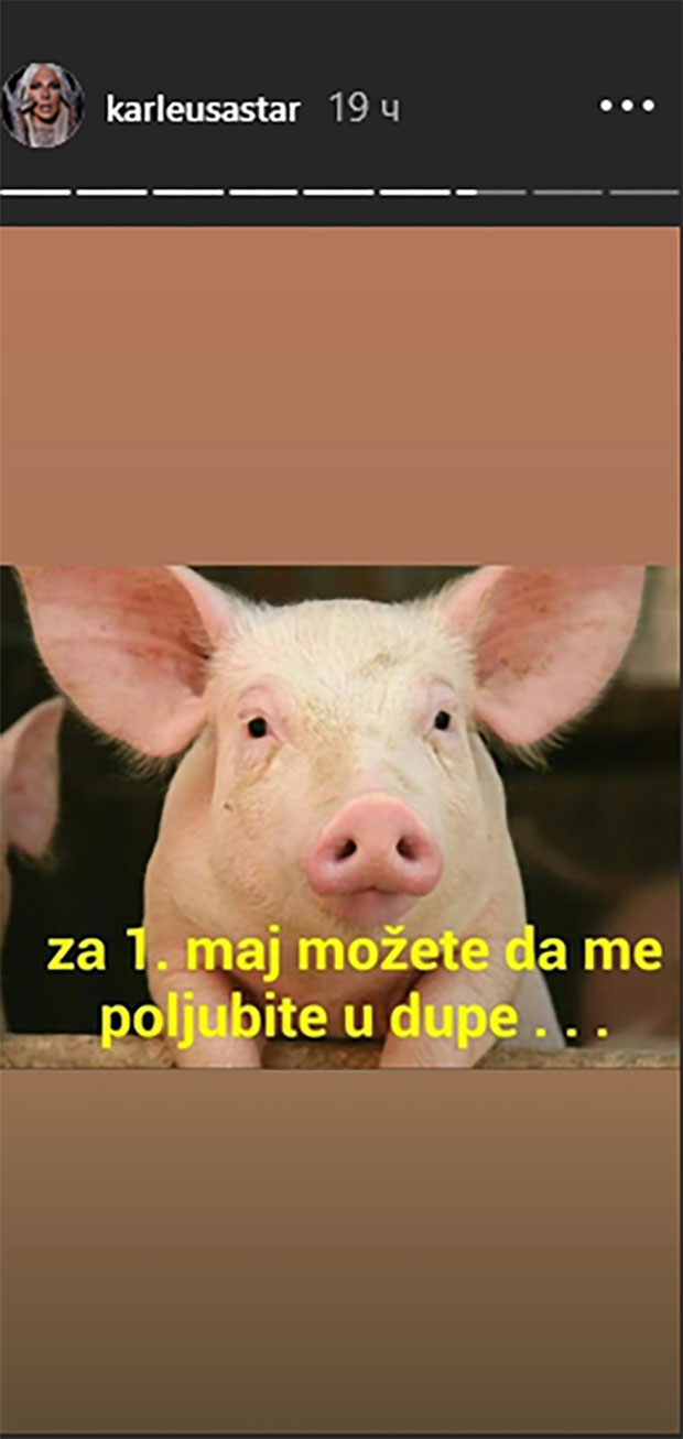 Ona je ovog puta okačila fotografiju svinje na Instagram storiju kako bi svima po milioniti put kroz redove rekla kako je vegeterijanac i da će svim svinjama mnogi moći za 1. maj da poljube du*e.
