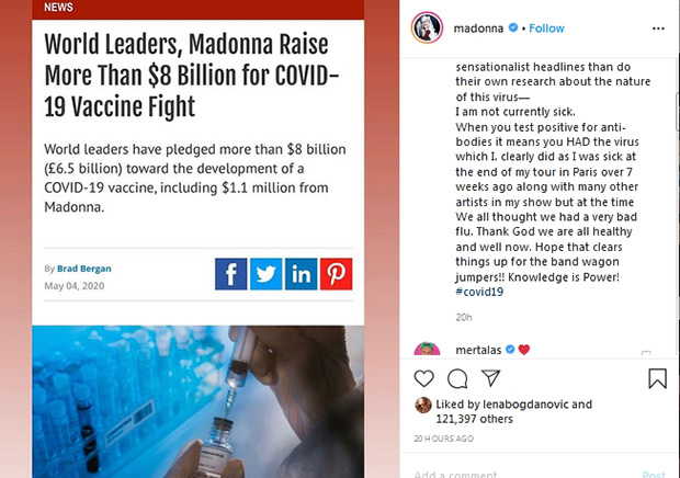 „Kada dobijete pozitivan test na anti-tela to znači da ste imali virus, što sam ja sigurno i imala, jer sam bila bolesna pri kraju moje turneje u Parizu. Pre tih sedam nedelja moji umetnici i ja osećali smo simptome ali smo mislili da imamo jak grip“, napisala je pevačica, navodeći da su sada svi dobro.