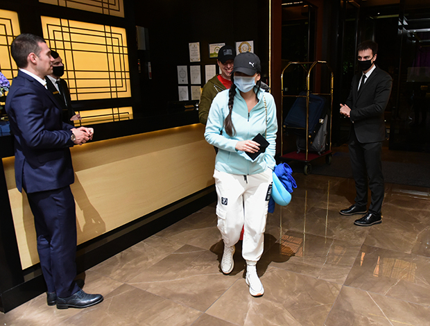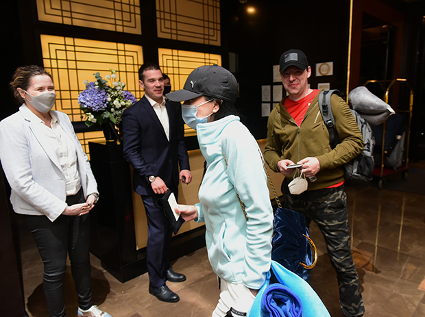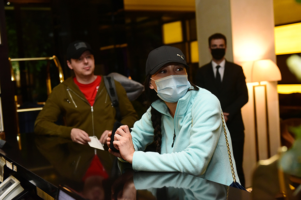 U hotel "Seint ten", gde će biti smeštena, stigla je sa zaštitnom maskom preko lica, a okupljenim novinarima je rekla: "Dođite sutra, biću u lepšem izdanju"