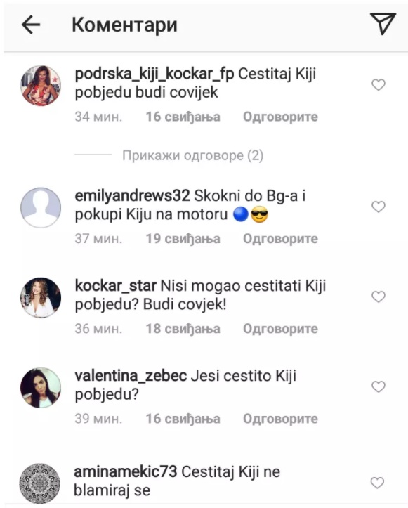 Naime, ispod jedne fotografije njegovi pratioci su ostavljalji komentare poput "Nisi mogao čestitati Kiji pobedu? Budi čovek!", "Čestitaj Kiji, ne blamiraj se" i slično, a da li će se on oglasiti ovim povodom ostaje da vidimo.