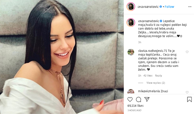 - Lepotice moja, hvala ti za najlepši poklon koji sam dobila od tebe, unuka Željka.....Vesela, hrabra moja devojčice, mnogo te volim - napisala je Ceca uz Bogdaninu fotografiju.