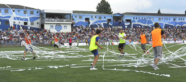 - Bate, neka je već jednom i u nas došla Zvezda. Da dođe i dogodine – rekao je jedan od starijih redara na stadionu.Zvuci „Marša na Drinu“, najavili su ulazak igrača na teren, uz gromke aplauze. „Delije“ su se sjajno provele pre utakmice. Grupa vodećih navijača, od njih ukupno 500 koliko ih je došlo da bodri tim, svratila je u restoran na piće i meze. U neko doba su stigli i trubači, pa je na brzinu napravljena sjajna fešta. Ona se kasnije proširila na tribine stadiona. Da nije bilo milion bačenih traka, baklji i dimnih bombi koji su uzrokovali nekoliko kraćih prekida moglo bi se reći da je sve prošlo besprekorno.
