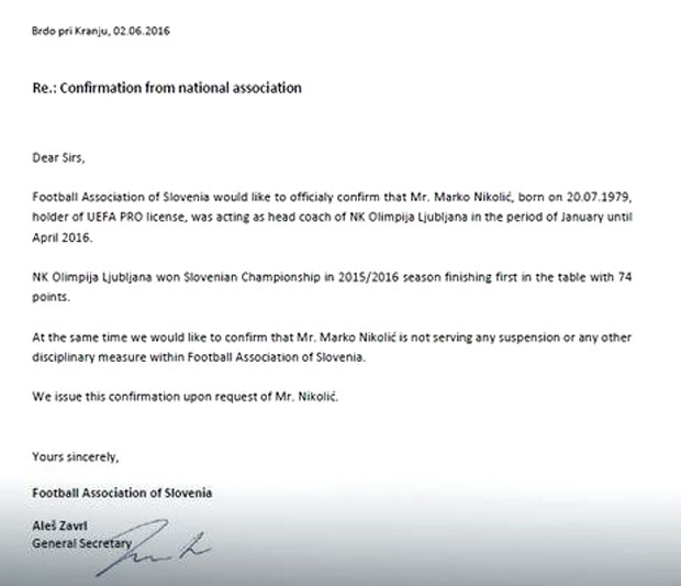 - Želimo da vas obavestimo da Marko Nikolić nije ni pod kakvom kaznom ili nekom drugom disciplinskom merom u nadležnosti Fudbalske asocijacije Slovenije - napisao je Zavrl u dokumentu koji je dostavljen na lični zahtev trenera Nikolića još 2. juna prošle godine.
