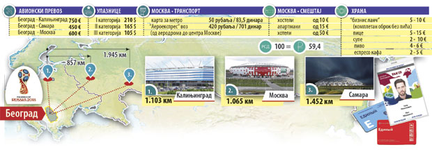 Objašnjenje je jednostavno: za avionsku kartu do Samare na meč sa Kostarikom (17. jun) potrebno je 450 evra, do Kalinjingrada na meč sa Švajcarskom (22. jun) 750 evra i do Moskve na duel sa Brazilom (27. jun) 600 evra. Na ovo mora da se doda od 10 do 200 evra za smeštaj (hosteli, apartmani,hoteli) i minimum 30 evra za hranu i piće za najmanje dva dana boravka u jednom od tri navedena grada. Najjeftinije karte (kupuju se isključivo preko internet sajta FIFA) su 105 dolara, a one skuplje su 165 i 210 "zelembaća".