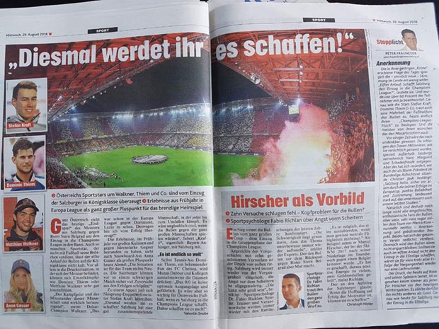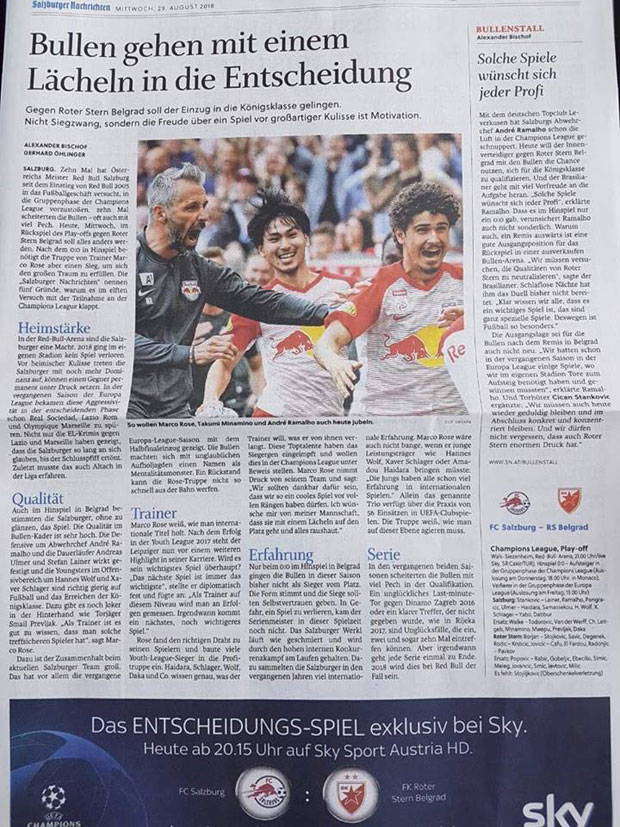 Mediji u Salcburgu posvećuju veliku pažnju revanš meču plej-ofa za plasman u Ligu šampiona! Listovi “Salcburger Nahrihten” i “Kronen Cajtung” su imali zanimljive najave za večerašnji susret.