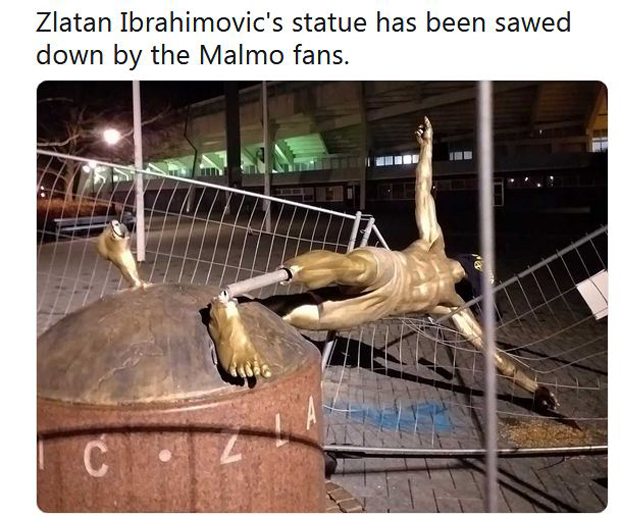 Vandali su konačno uspeli u svojoj nameri. U nekoliko navrata su oštetili veliki kip Zlatana Ibrahimovića u Malmeu, da bi sada uspeli i da ga obore.