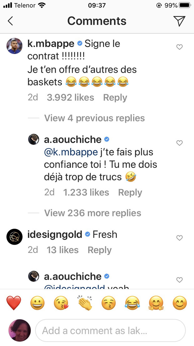 Ošiše je objavio fotografiju na kojoj namešta patiku, a Mbape mu je ostavio prikladan komentar ispod: "Potpiši ugovor. Pokloniću ti patike".