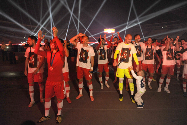 Ponosne zvezde večeri su bili fudbaleri, jedan po jedan izlazili su na cenar terena, na improvizovanu binu, uz skandiranje navijača i taktove "Marša na Drinu". Posebne ovacije dobili su treneri, prvo bivši Vladan Milojević kome su se svi "poklonili" za sve ono što je napravio za dve i po godine, a zatim je nagrađen i mister Dejan Stanković. Pozdravljen je i eks kapiten Marko Marin iako nije bio prisutan.
