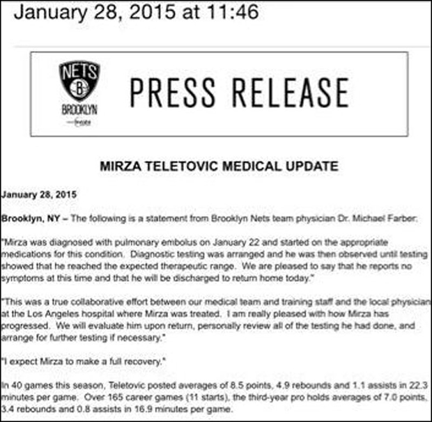 - Nakon što mu je dijagnostikovana plućna embolija, Mirza je podvrgnut lečenju određenim medikamentima. Testiranja su pokazala kako je terapija za sada veoma uspešna i možemo reći da nema nikakvih negativnih simptoma. On će u toku dana biti otpušten iz bolnice - rekao je doktor Netsa Mihajl Farber.
