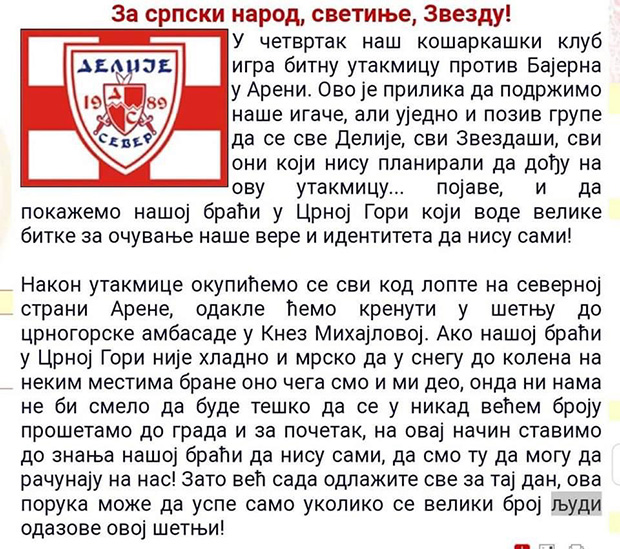 Delije pozivaju sve navijače na akciju: Šetnja do ambasade Crne Gore