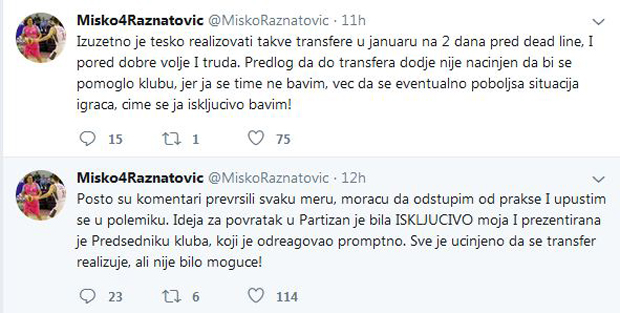 - Pošto su komentari prevršili svaku meru, moraću da odstupim od prakse i upustim se u polemiku. Ideja za povratak u Partizan je bila isključivo moja i prezentovana je predsedniku kluba koji je odreagovao promptno. Sve je učinjeno da se transfer realizuje, ali nije bilo moguće - napisao je Ražnatović.