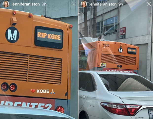 Dženifer Aniston je na svom Instagram nalogu objavila fotografije koje svedoče o tome da su u žalosti i javne ustanove. Glumica je ovekovečila i svetleći natpis na gradskom prevozu gde umesto broja autobusa, na zadnjem staklu, piše: RIP KOBE.
