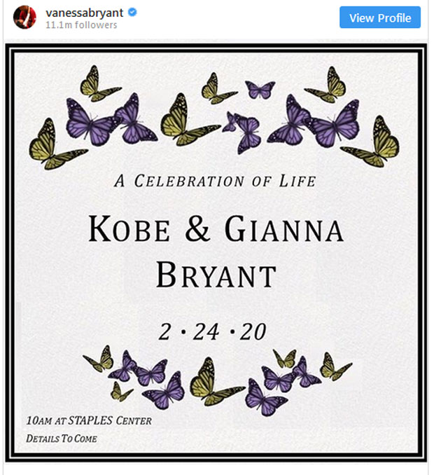 Oproštaj od Kobija, Đijane i još sedmoro ljudi koji su nastradali u padu helikoptera će se održati na simboličan dan – 24.2.2020. godineu 10 sati po lokalnom, odnosno 18 po srednjeevropskom vremenu. U pitanju su brojevi koje su na dresovima nosili Kobi i Đijana – 24 i dva.