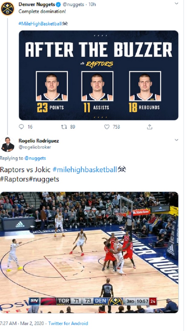 Srpski centar upisao je 12. ovosezonski tripl-dabl, a 40. u karijeri. Suprotni tim kao da nije imao rešenje za njegove majstorije. Iako je u jednom trenutku svih pet igrača Reptorsa čuvalo je Jokića pokušavajući da ga zaustavi, nisu uspeli.