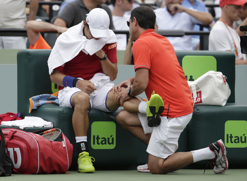 Još jedan servis gem u prvom setu je izgubio branilac trofeja zbog toga što na brejk-loptu protivika nije od sokolovog oka zatražio proveru sudijskog. Japanac je poslao lopticu daleko u aut, ali mu je dosuđen poen i smanjenje rezultata na 3:4. U nastavku je nastavio da gađa muve, skoro i ptice, ali za to nije dobijao poene.