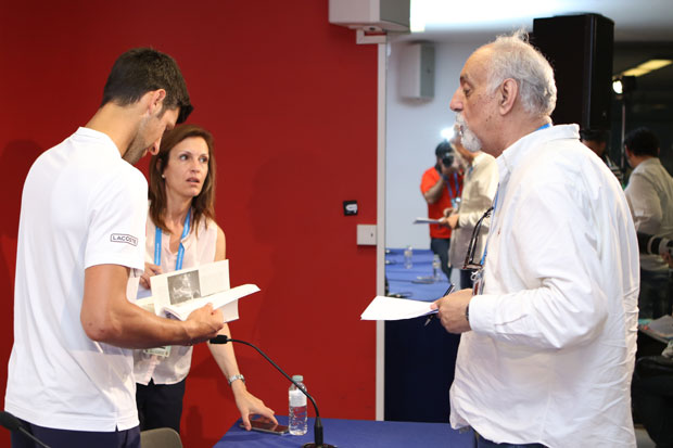 Kasnio je na konferenciju za štampu oko 45 minuta, ali više od 50-tak novinara strpljivo je čekalo Novaka Đokovića. Kada se pojavio, bio je raspoložen, spreman na šalu. U više navrata njegovi odgovori izazvali su salve smeha.