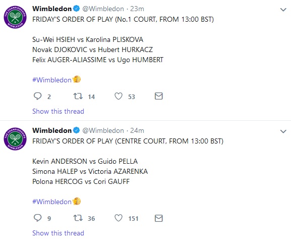 Srpski as i Poljak na teren će izaći po završetku meča Hsije i Pliškove. Na Centralnom terenu sutrašnji program otvaraju Kevin Anderson i Gvido Pelja, a potom slede mečevi Halep - Azarenka i Hercog - Gauf.