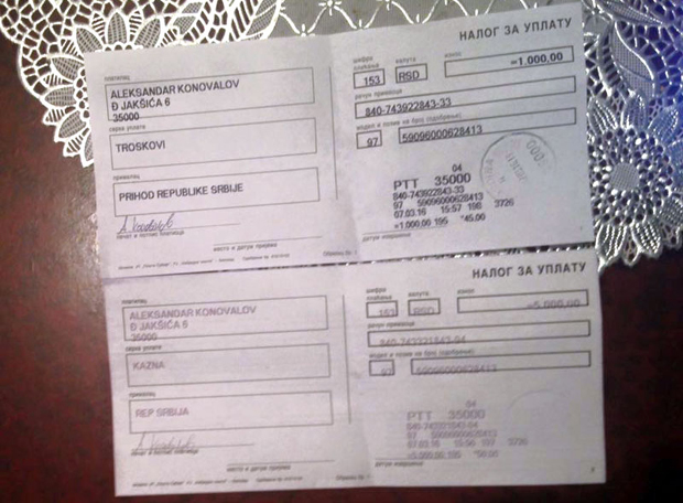 - Danas sam morao da platim kaznu, jer su policajci došli da me vode zbog 6.000 dinara. Razlog kazne je slavlje posle osvajanja svetske titule u Brazilu, gde sam predstavljao svoju zemlju i ponosno pevao himnu! Tačnije, rodbina me je dočekala ispred kuće sa trubačima, koji su odsvirali samo tri pesme. Očigledno da je nekome to smetalo i pozvao je policiju! Kada su oni došli, videli su pehar i rekli da neće da pišu kaznu, ali ipak su je napisali! Eh državo, hapsite kriminalce, narko dilere... Njima ne smete ni da priđete, a mene koji sam uspešan sportista ganjate zbog slavlja od 10 minuta- napisao je na fejsbuku, pored fotografija plaćene kazne Aleksandar Konovalov.