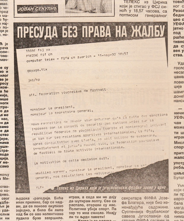 "Mač nepravde" prvi put smo osetili 1992. godine, kada je UEFA odlučila da s Prvenstva Evrope u Švedskoj izbaci selekciju koju je predvodio Ivica Osim. Piksi Stojković, Dejo Savićević i ostali vraćeni su sa severa Evrope, u dramatičnoj akciji spasavanja i evakuacije JAT-ove letelice kojom je upravljao legendarni pilot Steva Popov. Šveđani, na nagovor "odozgo", čak nisu hteli da sipaju gorivo za let do Jugoslavije... Prljavo, da prljavije ne može biti.