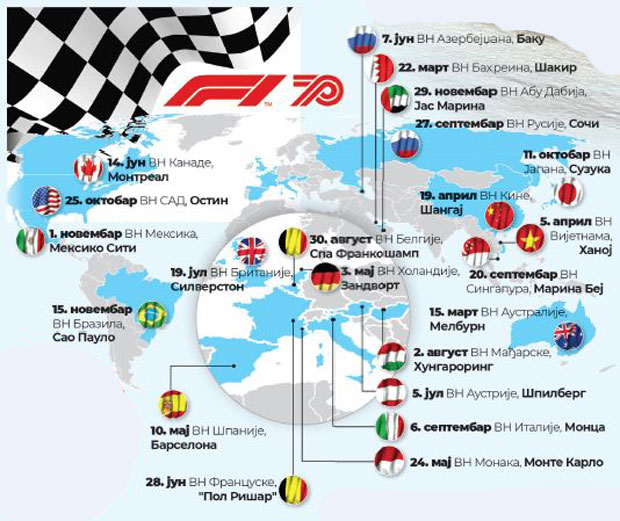 ŠAMPIONAT sveta Formule 1, 71. po redu, startuje 15. marta trkom za Veliku nagradu Australije u Melburnu. U kalendaru je predviđeno da se voze 22 trke, ali je Velika nagrada Kine, koja je trebalo da se održi 19. aprila odložena zbog virusa korona. Novi termin kineskog Gran-prija biće, kažu, naknadno određen.