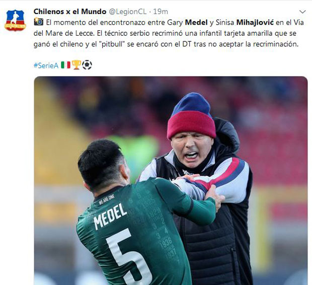 Prvavi Čileanac je burno reagovao i odgurnuo Mihajlovića i tada su ušli u "klinč". Siniša je reagovao tako što je podigao jednog igrača sa kupe i signalizirao mu da krene da se zagrevau, da bi se potom verbalni sukob srpskog trenera i čileanskog igrača nastavio sve dok sudija nije poslao igrače na pauzu.
