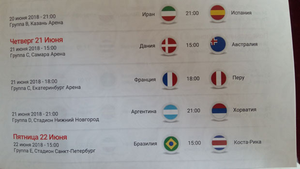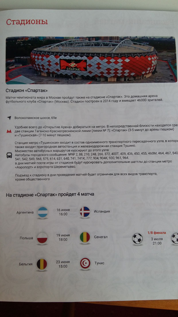 Vodič nije poštedeo ni Srbiju, pošto je na spisku mečeva koji će se igrati na stadionu Spartaka u Moskvi izostaje onaj koji će 27. juna igrati naša selekcija protiv Brazila.