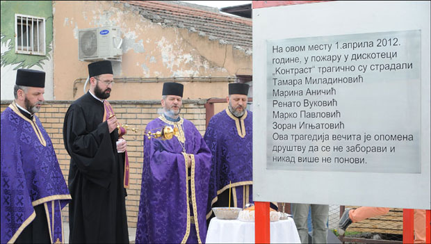 NA spomeniku, ćirilicom, ispisan je tekst: "Na ovom mestu 1. aprila 2012. godine, u požaru u diskoteci 'Kontrast', tragično su stradali Tamara Miladinović, Marina Aničić, Renato Vuković, Marko Pavlović, Zoran Ignjatović." Ova tragedija večna je opomena društvu da se ne zaboravi i nikada više ne ponovi.