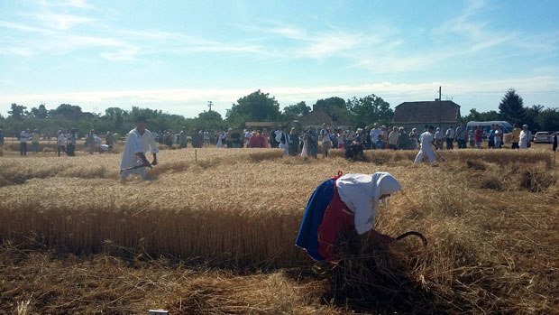 Osokoljeni gradonačelnikovim rečima risari su dohvatili kose i jedan za drugim počeli su da padaju otkosi žita. Kako risar kosi, tako risaruša skuplja i veže pokošeno klasje.