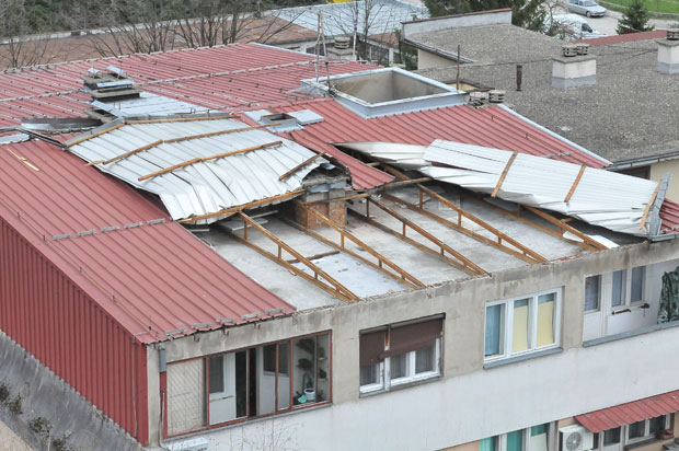 Oštećen deo krova na stambenoj zgradi u kraljevačkom naselju Moša Pijade / Foto G. Šljivić