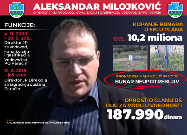 Portal Srbija Danas piše da je direktor Direkcije za izgradnju Opštine Paraćin, Aleksandar Milojković dao nalog za kopanje bunara u vrednosti od 10,2 miliona dinara u kome nema dovoljno vode