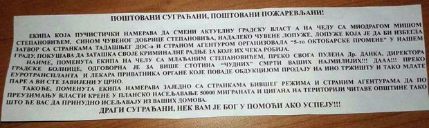 Sporni letak sa teškim optužbama, koje spominju i sumnjive smrti pacijenata Opšte bolnice, od kojih su organi navodno uzimani, deljen je ubacivanjem u poštanske sandučiće. Sumnja se da je podeljeno stotinak komada, a da su dostavljači anonimni. Niko od dosad saslušanih naprednjaka nije želeo da govori za medije, u interesu istrage, a to nisu htele ni ostale njihove stranačke kolege.