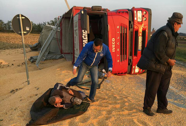 Narodni poslanik i predsednik POKS-a Žika Gojković na putu za Novi Sad, između Stapara i Sombora, ugledao je danas prevrnut kamion sa prikolicom i odmah je pritrčao da pomogne vozaču