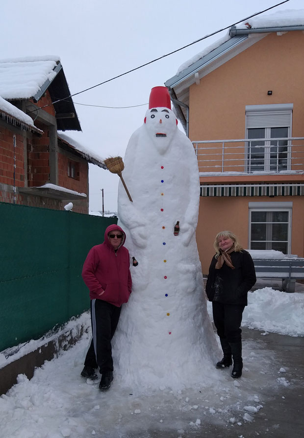 U pomoć su mu priskočile i prve komšije, Svetlana i Stefan Đorđević, pa je Sneško Belić počeo da raste i u visinu, a bogami i u širinu. Od početne gomile snega „izrastao“ je na metar, pa na dva, a posle tri sata „akcije“ i na tri i po metra visine.