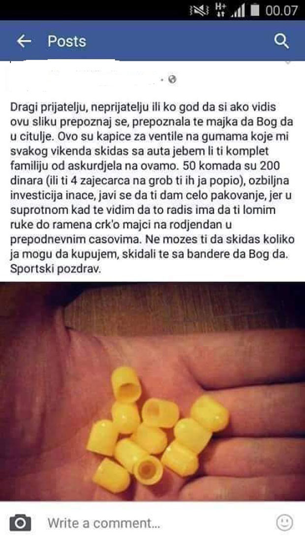 Nakon što mu je dojadilo da svakog vikenda gleda kako mu sa automobilskih guma neko skida kapice, Zaječarac P. B. osuo je, putem ’’fejsbuka’’ gomilu urnebesnih pretnji