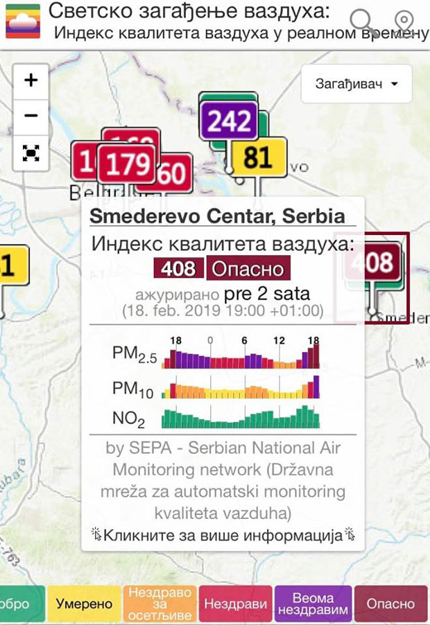 SMEDEREVO je 18. februara bilo jedan od najzagađenijih gradova na svetu! Maksimalne koncentracije suspendovanih čestica izmerene na automatskim stanicama za monitoring su iznosile 408 mikrograma po kubnom metru, a granična vrednost je 50, pa se radilo o opasnom zagađenju koje toliko ugrožava zdravlje da se obično preporučuje da ljudi ne izlaze iz kuća.