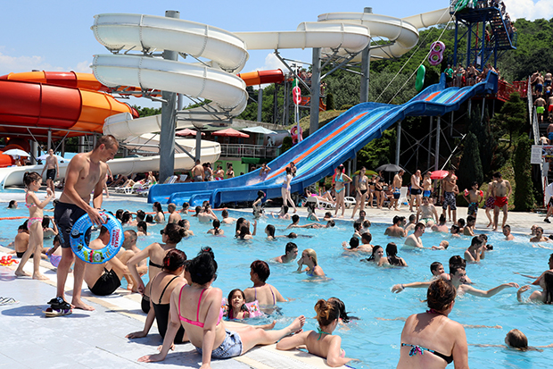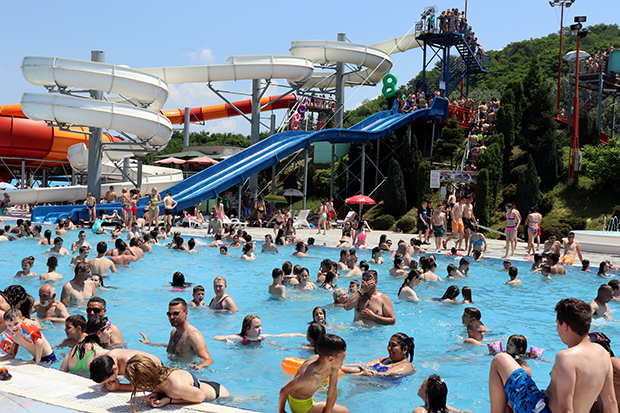 Osim u bazenima, velika gužva je i na toboganima i na ležaljkama ispod suncobrana. Punom parom rade i restorani brze hrane i kafe poslastičarnice.