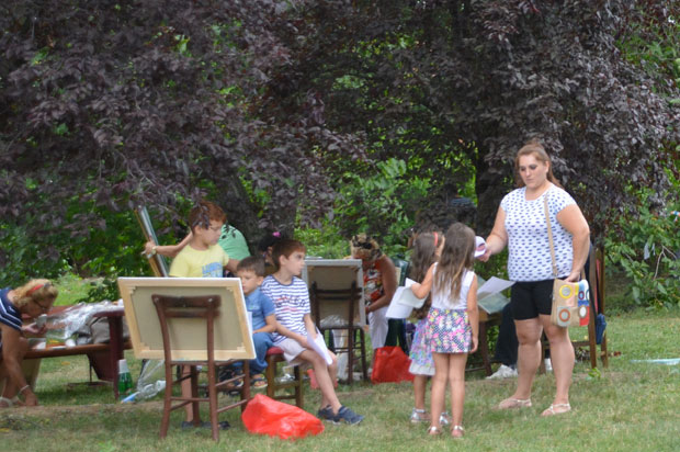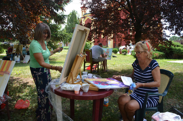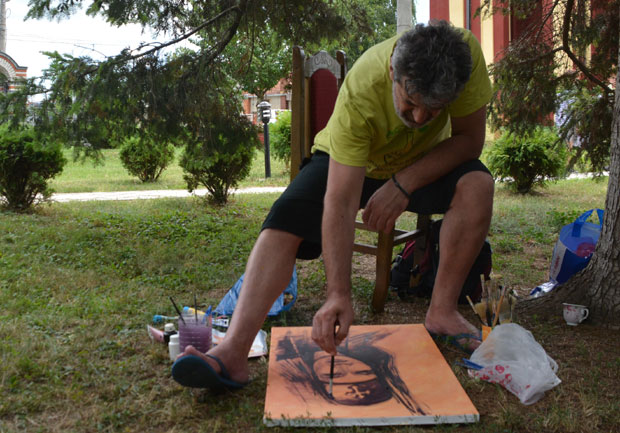 Svaki je slikar pronašao svoje mesto: neko kraj bogomolje, neko ispod drveta, neko, opet, na drvenoj klupi, kod crkvene kuće. Jedan od naših najboljih karikaturista Goran Ćeličanin nanosi boje bez oslonca. Platno je položeno na zemlju, po njemu slobodno šetaju mravi.