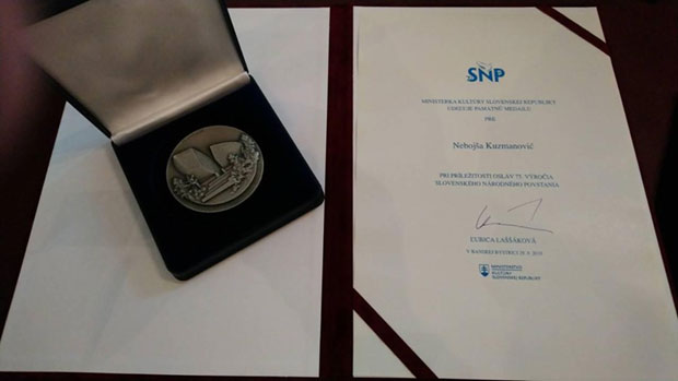 Istakavši veliku zahvalnost za doprinos na afirmisanju srpsko-slovačkog prijateljstva i kulturnih veza, u njegovom publicističkom i naučnom radu vezanom za slovačko-srpske teme,Kuzmanoviću je ministarka Lašakova uručila počasnu medalju 75. godišnjice Slovačkog narodnog ustanka.
