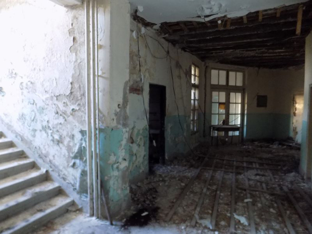 Ulazimo u veliki hol. Za nama se čuje škripa polomljenih "leptir" vrata. Hladnoća se uvlači pod kožu. Pogled ka stepenicama, pa na delove plafona koji su završili na podu.