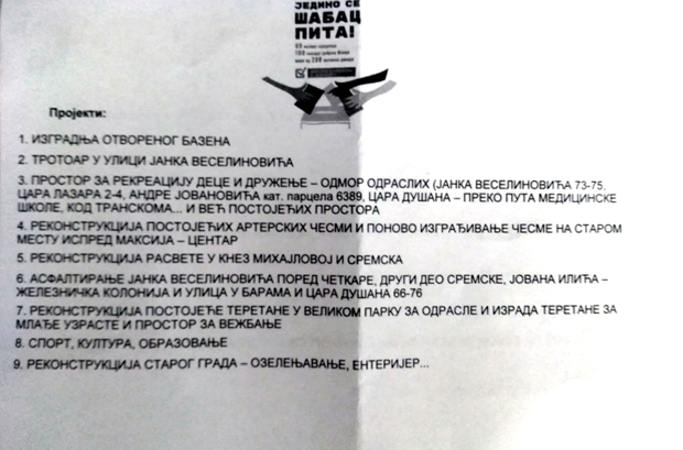 Kako god bilo, čelni čovek Šapca neumorno obilazi seoske i gradske mesne zajednice, a u poštanske sandučiće građana stižu pozivi za glasanje - ozbiljniji nego za regularne izbore, sa imenom i prezimenom, te listom predloženih projekata na poleđini. Istovremeno, u pešačkoj zoni i svim ulazima u Šabac su još od minulog vikenda postavljeni transparenti sa pozivima za odlučivanje 8. decembra.