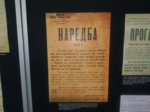 „Danas sam naredio da se obese na požarevačkom korzou šest komunista uhvaćenih u borbi sa oružjem u ruci i crvenom zvezdom na kapi, koji nisu hteli da se predaju“, saopštava u jednom proglasu Ljubo Babić, komandant Velikomoravske grupe.