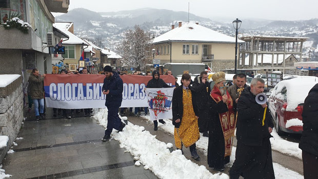 Čelo kolone u Prijepolju, na kojem je bio istaknut transparent sa sloganom “Sloga biće poraz vragu”, predvodio je episkop mileševski Atanasije sa sveštenstvom. U Priboju je stajao natpis “ Priboj je uz srpsku Spartu”. U gradu na padinama Zlatara uprkos snažnoj vejavici vernici su prošetali centralnim ulicama.