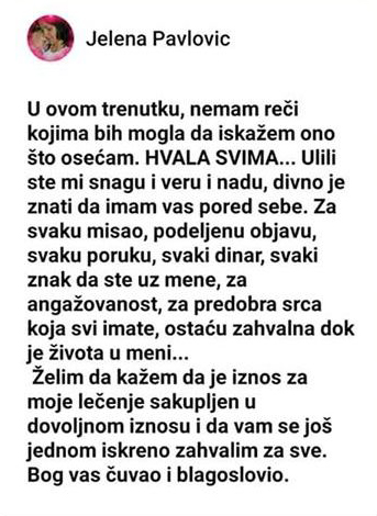 -Za svaku misao, podeljenu objavu, svaku poruku, svaki dinar, svaki znak da ste uz mene, za angažovanost, za predobra srca koja svi imate, ostaću zahvalna dok je života u meni - poručila je ova mlada Požarevljanka, majka dve devojčice.